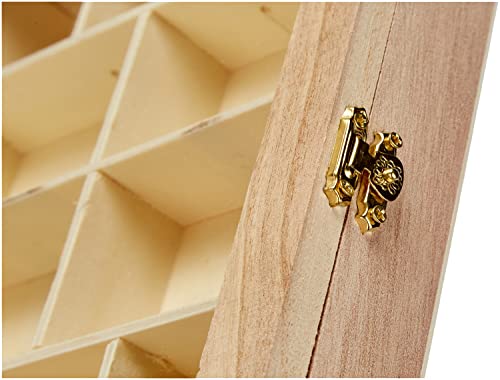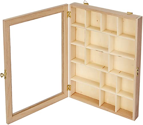 Vitrine en bois 23 x 28cm à décorer selon vos envies. Personnalisée avec du papier déco patch, des serviettes, de la peinture, des pochoirs. Au gré de votre créativité, cette vitrine en bois aura beaucoup de charme. Avec ses 16 compartiments, cette vitrine en bois recueillera tous les petits objets que vous aimez: une collection de dés à coudre, de petites figurines, de fèves, de médailles, une composition d’épices ou de fleurs séchées etc. La profondeur de cette vitrine est de 3cm et la taille de ses différents compartiments varient entre 5 x 5cm, 5 x 7,5cm, 5 x 8,3 et 5 x 11cm. A poser sur un meuble ou à suspendre au mur, cette jolie petite vitrine en bois abritera tous vos trésors avec élégance. Matière: bois et verre. Fermoir et charnières dorés.